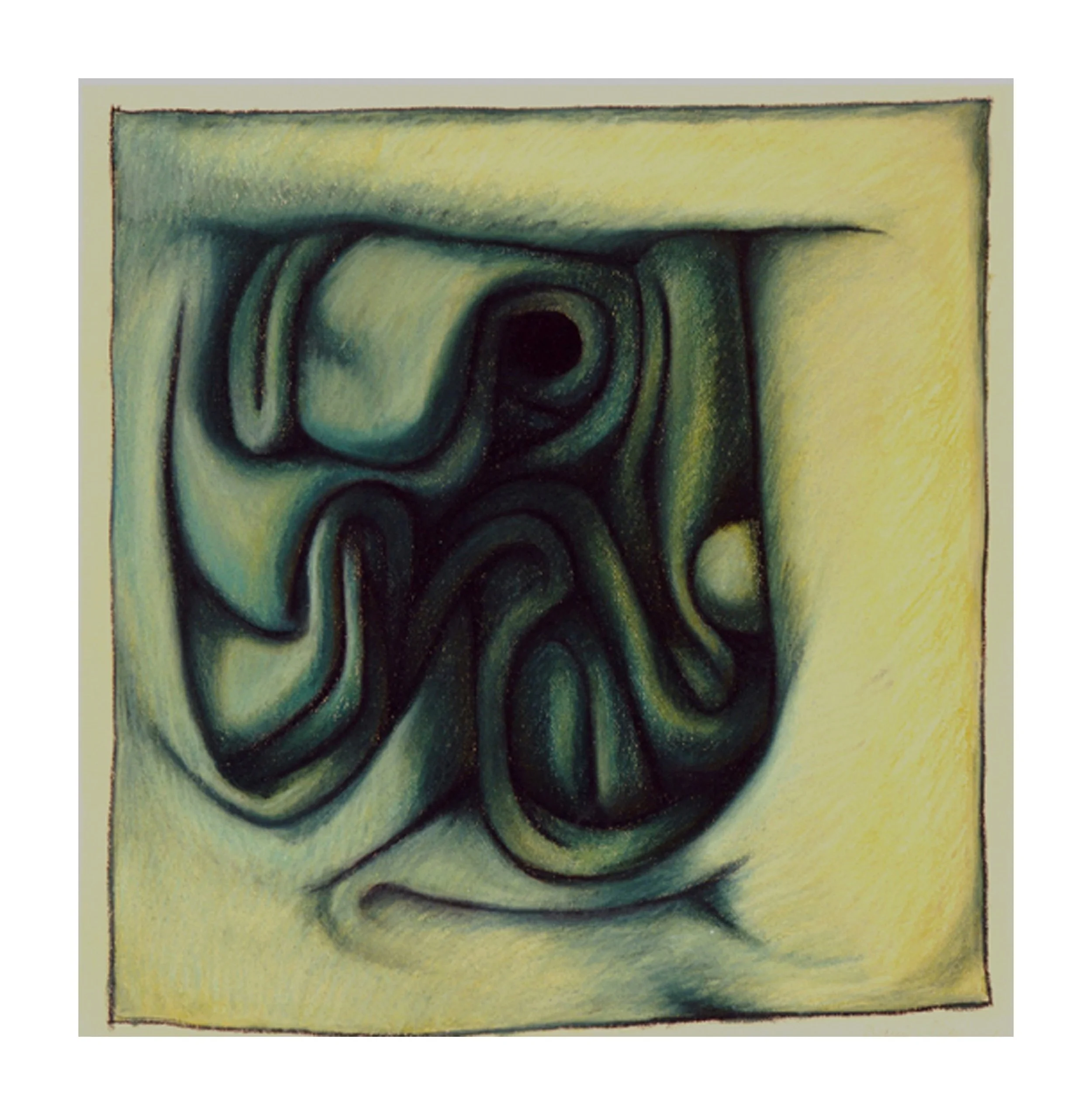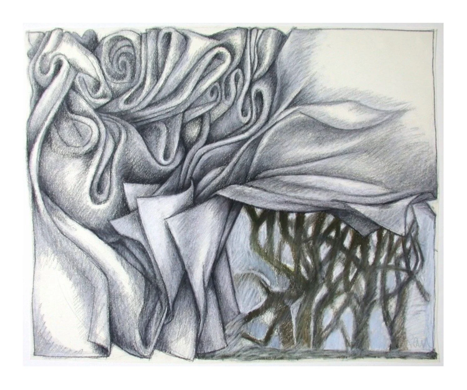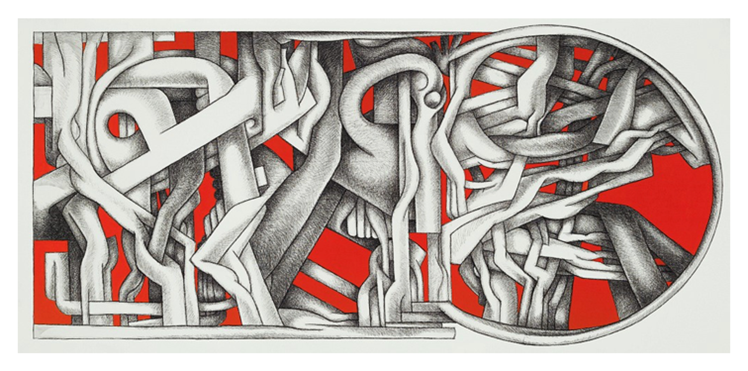 An abstract black and white drawing with intertwined, looping lines creating a complex pattern.