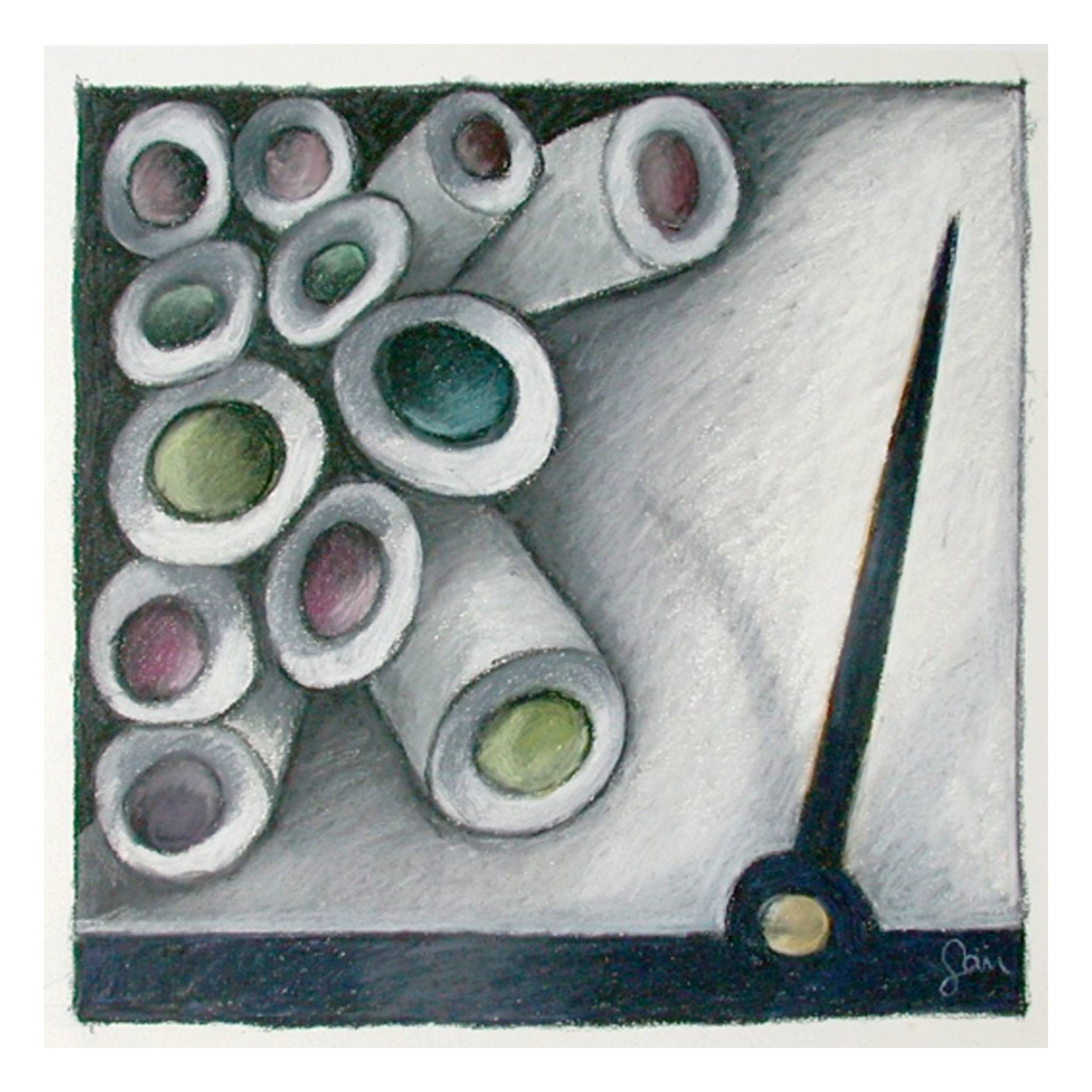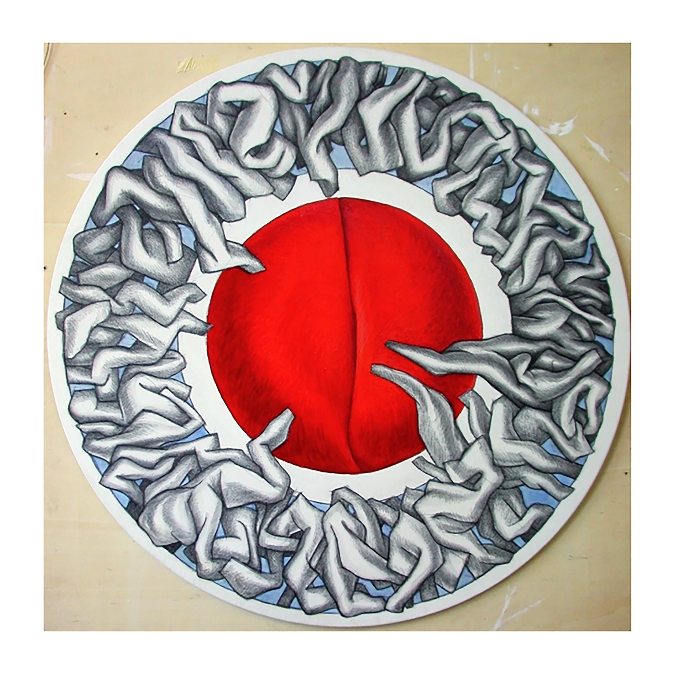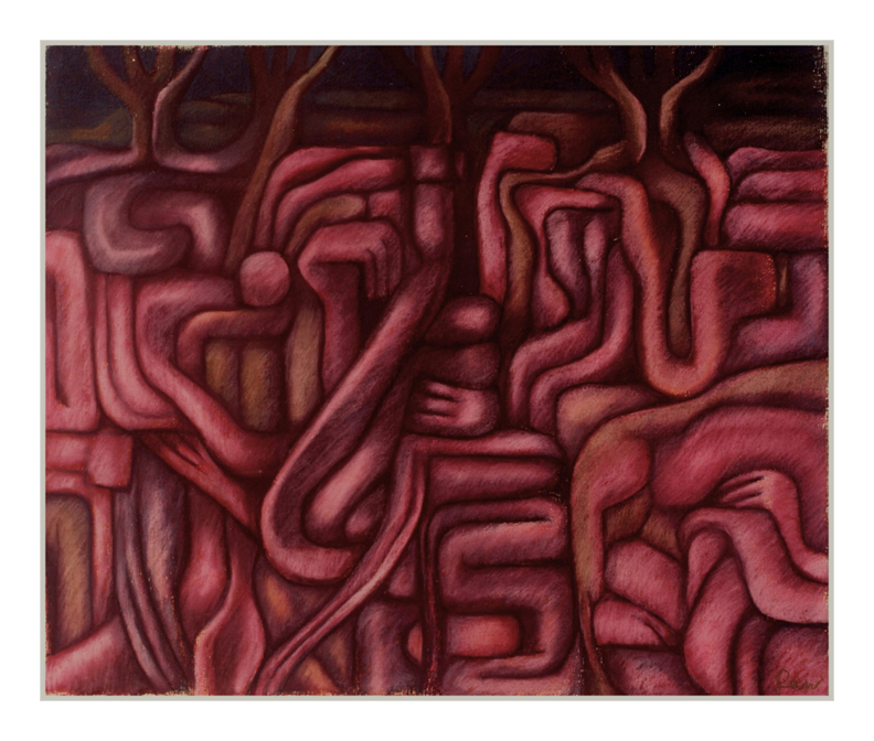 An abstract black and white drawing with intertwined, looping lines creating a complex pattern.