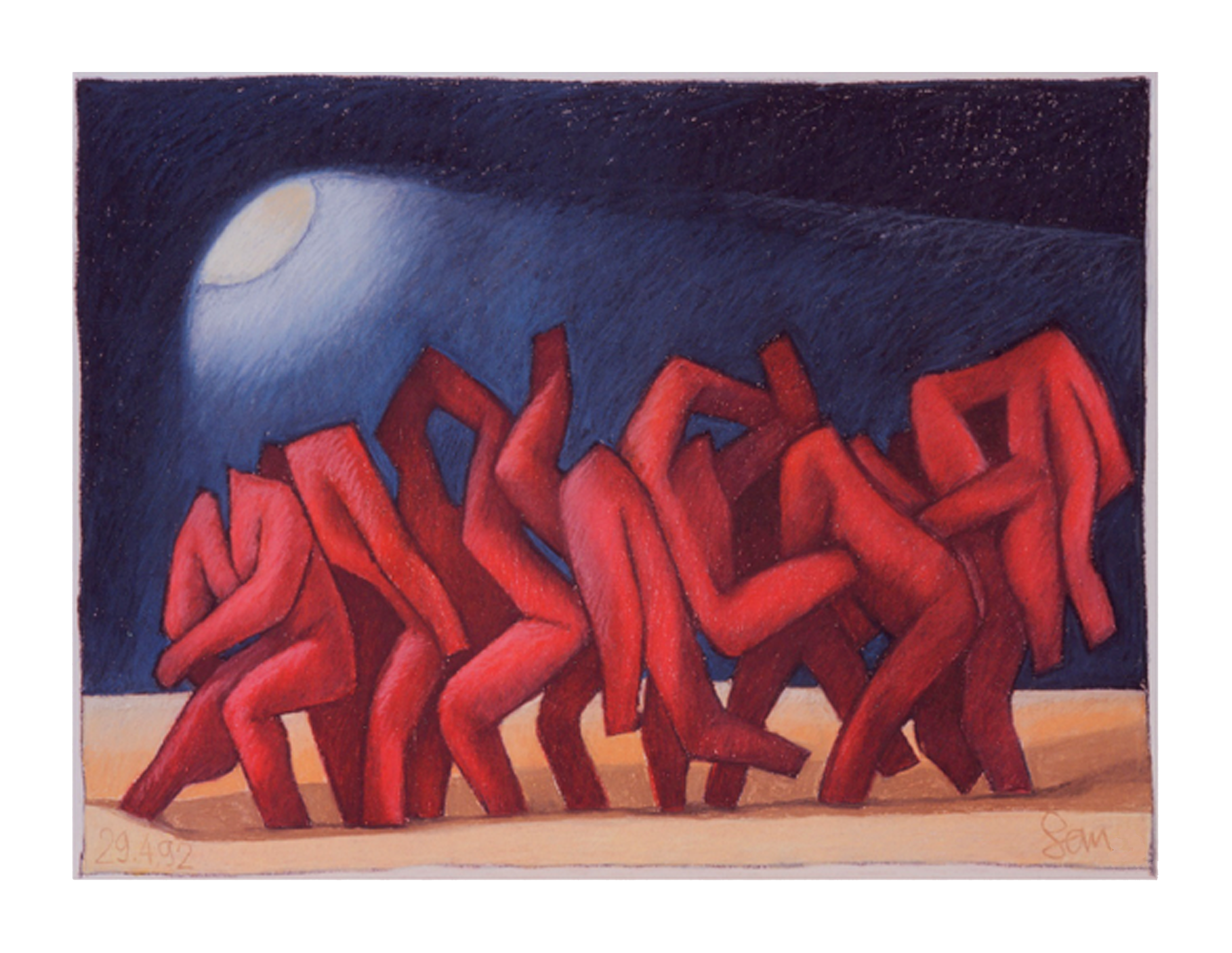 The ship sways slowly and silently somewhere in the middle of the Indian Ocean. The huge moon, orange, nearly red, hangs like a heavy belly in the sky. Swarms of flying fish, with their silvery wings, flip around and dive into the waves. They are playing with millions of stars.